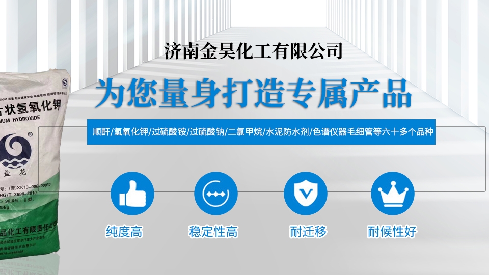 • 主營(yíng)產(chǎn)品為氫氧化鉀、過(guò)硫酸銨、過(guò)硫酸鈉、順酐、二氯甲烷、水泥防水劑等六十多個(gè)品種